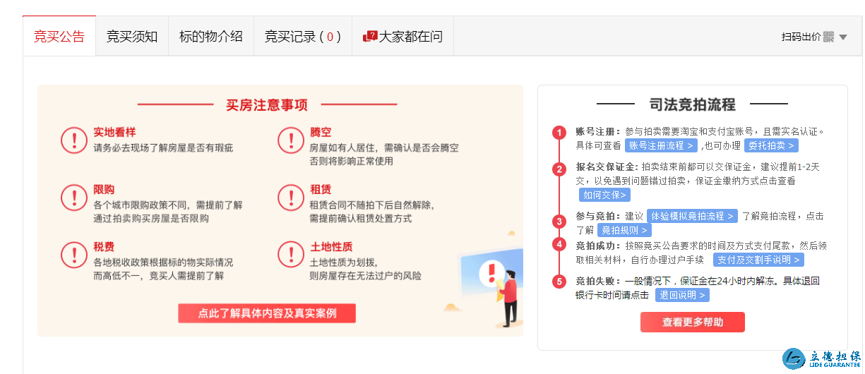 小編建議如果您希望以省時、省力的方式,以 低的風險拍到心儀的房子,建議您與像【立德擔保】這樣正規、有經驗的公司合作,我們持續經營15年,在拍賣房方面,我們有專業的團隊為您提供拍賣房房源推薦、拍前調查、稅費核算和減免咨詢、拍賣房按揭貸款擔保、協助過戶、協助清場咨詢等一站式的服務,助您拍房無憂,另外我們有銀行的專門授信額度,到賬快, 高額度可貸8成。想要了解更多法拍房的注意細節,可以在線聯系法拍專員。