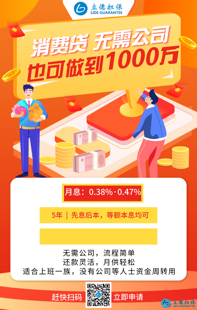 接下來,為您推薦銀行熱門貸款產品,無需公司,額度也可貸到1000萬,月息:0.38%-0.47%,期限5年,先息后本、等額本息由您決定,趕緊咨詢【立德擔保】貸款專家吧!